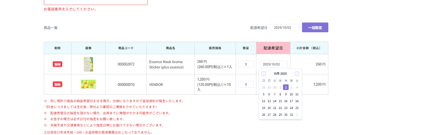 closedNo6 Chỉnh sửa ngày min của field [ 配達希望日 ] và calender [ 一括設定 ]