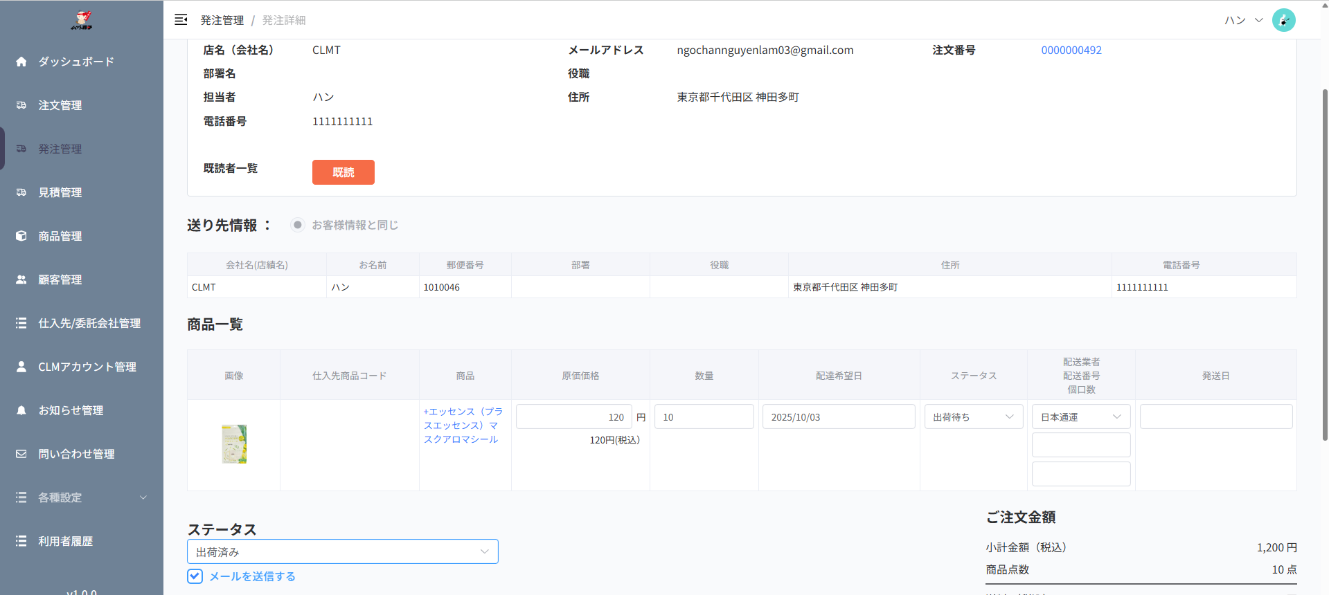 -Tại purchase-order, nhập giá trị cho 1 trong 3 field > sau đó chuyển status 出荷済み => gửi mail số 40