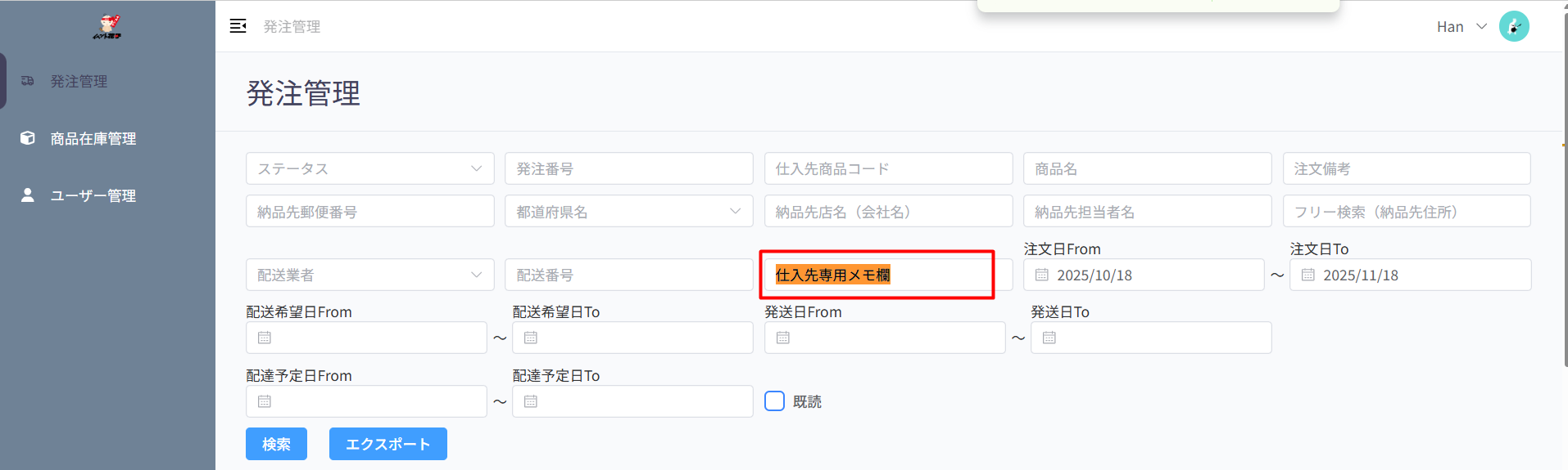 field 仕入先専用メモ欄 đối với logictics ko cần nên ẩn đi