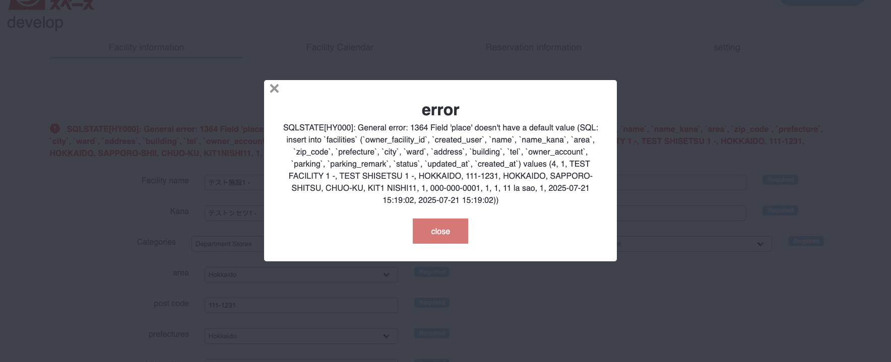 Chức năng copy đang có lỗi. Thực hiện bước: Nhấn vào xem detail facility → chọn コピーして新規作成 (Copy) → Chọn 登録 (Lưu) → Xảy ra lỗi nhưng ko thông báo message nên ko biết tại sao bị lỗi. Bên staging hiện tại có thông báo nguyên nhân lỗi
