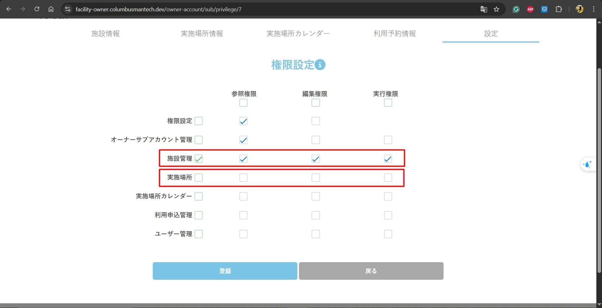 Sub account chỉ có quyền (参照 / 編集 / 実行) đối với chức năng 施設管理.