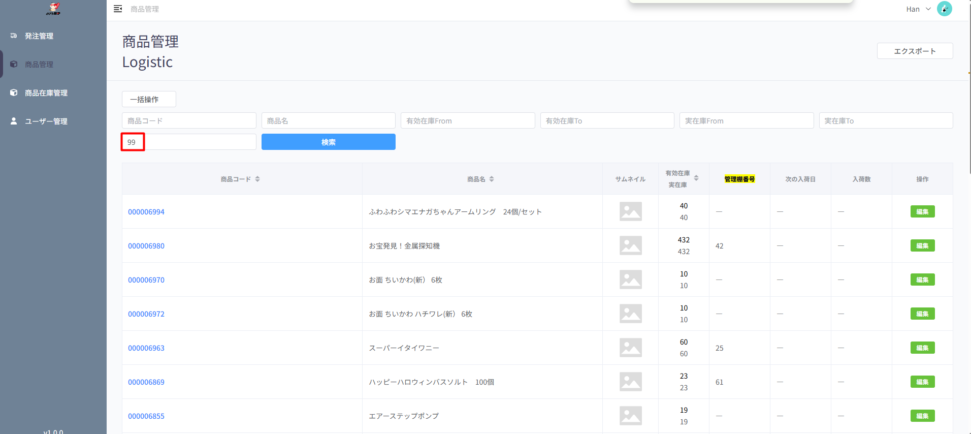 Input vào field 管理棚番号 data 99 và search => list vẫn giữ nguyên, không lọc theo dữ liệu đã search