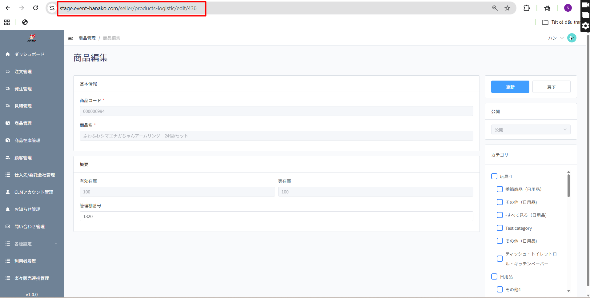 -Step 2: truy cập trang product logistic bằng URL /seller/products-logistic/edit => truy cập và edit thành công mặc dù đang log acc admin/vendor