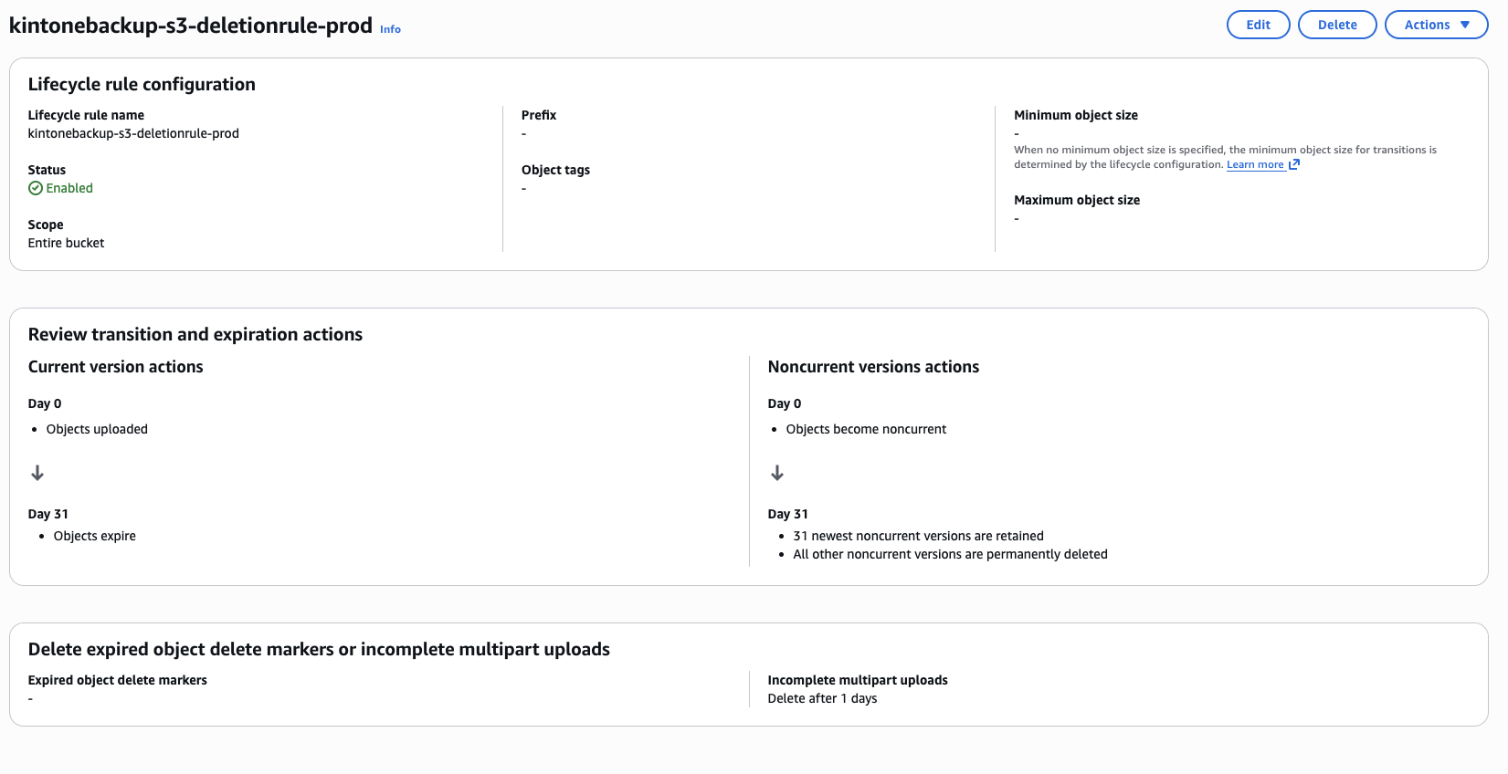 https://ap-northeast-1.console.aws.amazon.com/s3/management/kintonebackup-s3-dev/lifecycle/view?region=ap-northeast-1&id=kintonebackup-s3-lifecycle-31days-deletion-dev