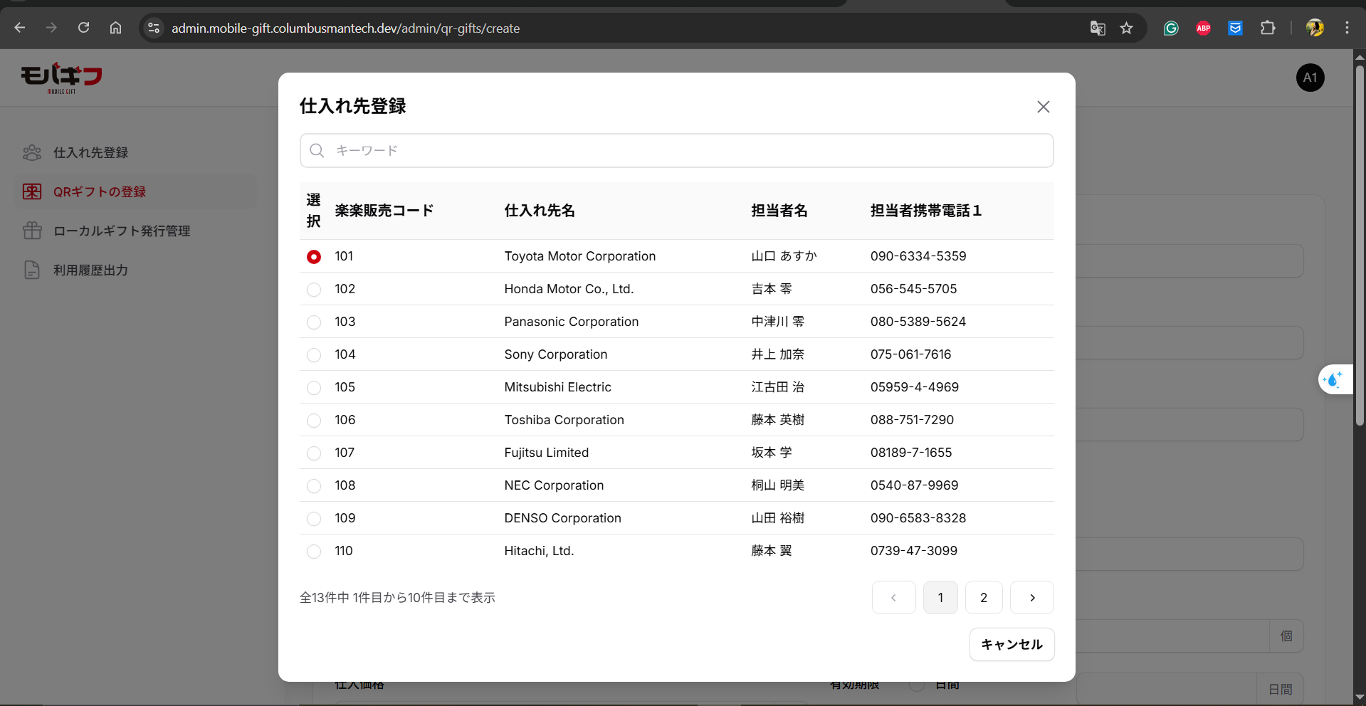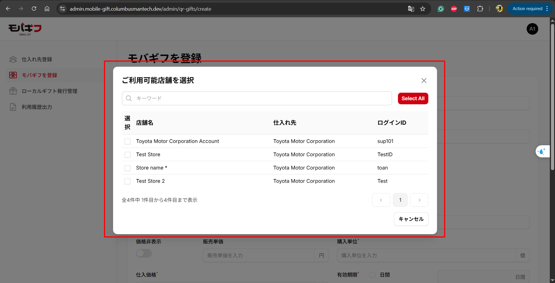 Field ご利用可能店舗* đang là text input khi chọn ギフト種類* là ローカルギフト