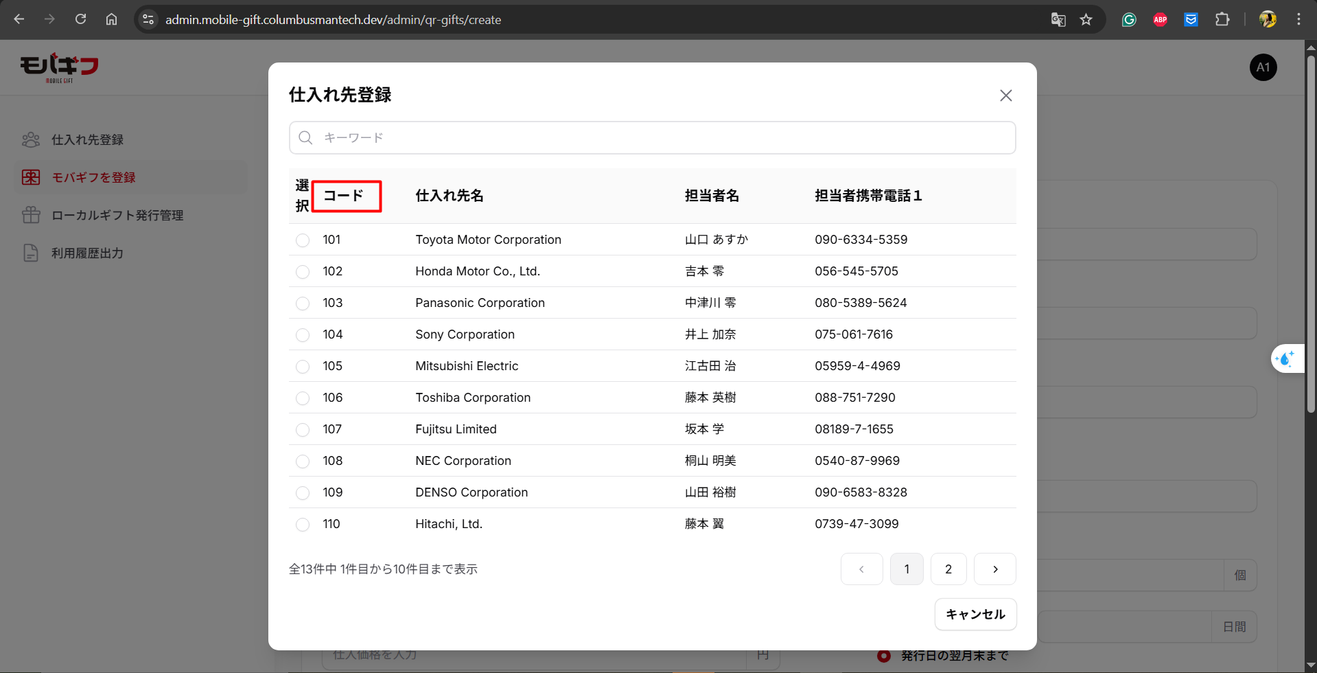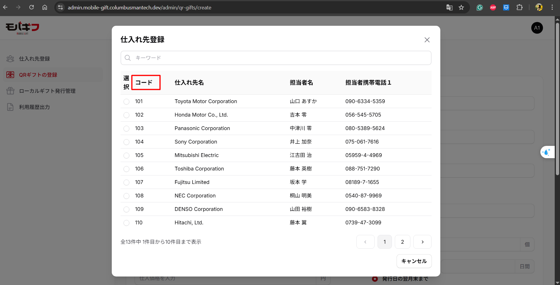 Field label hiển thị là コード
